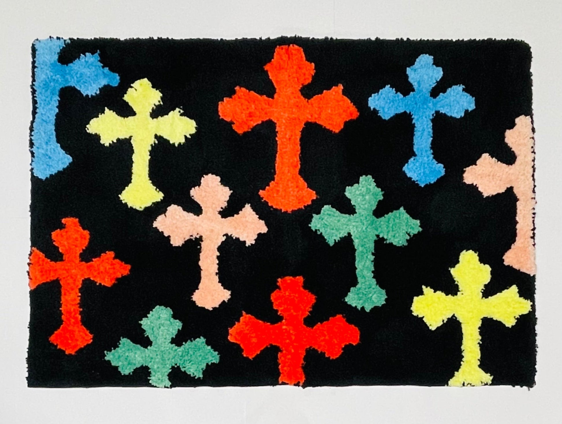 32x23 machine-tufted rug, built like a flex piece for your floor. Chrome Hearts energy—crosses, fleur-de-lis, daggers. Streetwear luxury you can step on